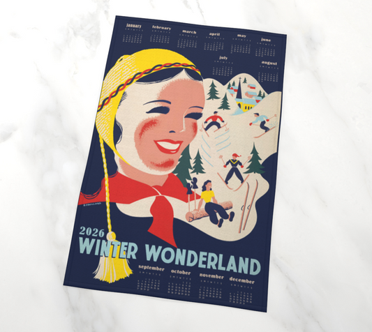 2026 Tea towel ski calendar winter wonderland vintage Ski Art
