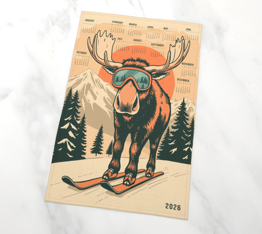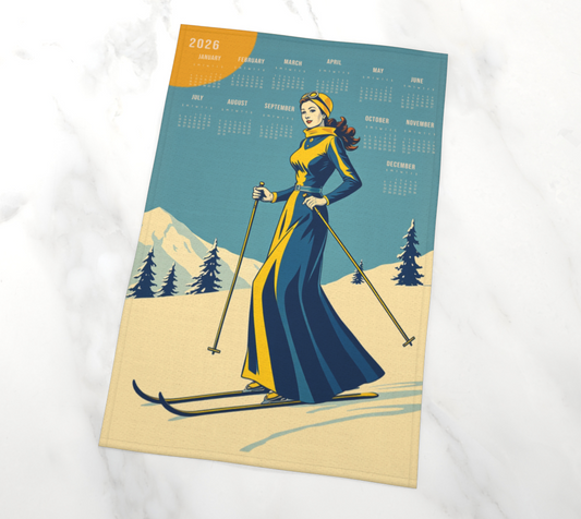 2026 Tea towel ski calendar Moon Lady Skier made 100% cotton