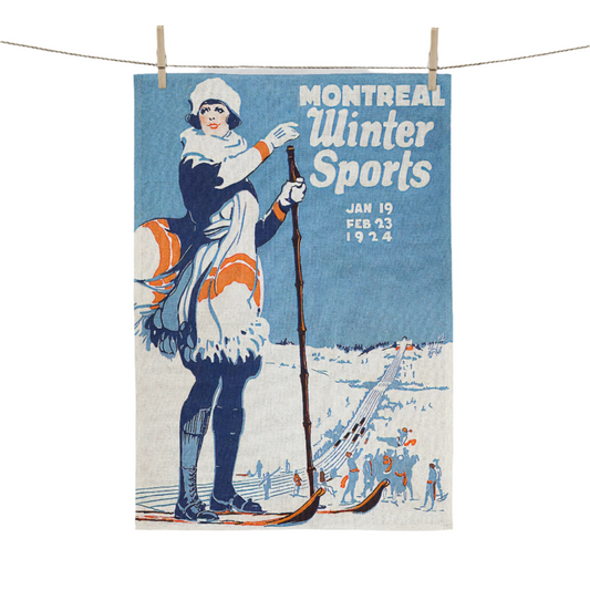 Tea towel home decor in Vintage Montreal winter sport Ski Collage Art for your kitchen or hang on your walls